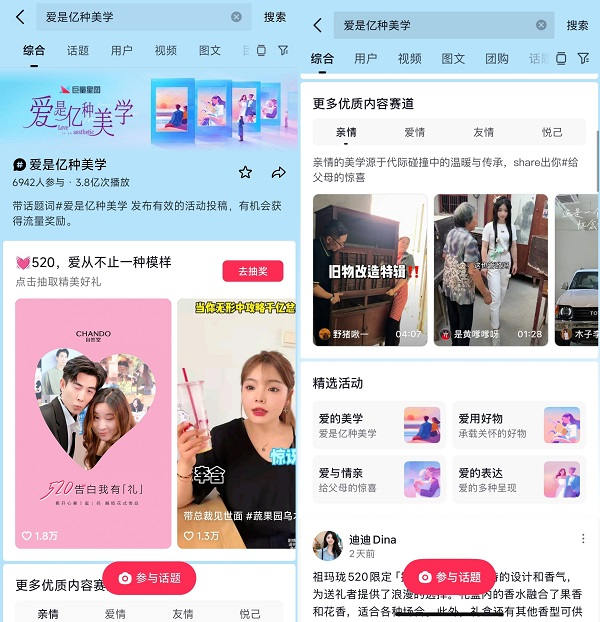 這次520,巨量星圖打造了一系列頗具節日氛圍感的話題。主話題#愛是億種美學 截至目前已經獲得15.5億次播放。分賽道話題#給父母的驚喜 、#友情最好的樣子、 #愛的一萬種表達 、#悅人不如悅己 也引發大量的創作和關注。