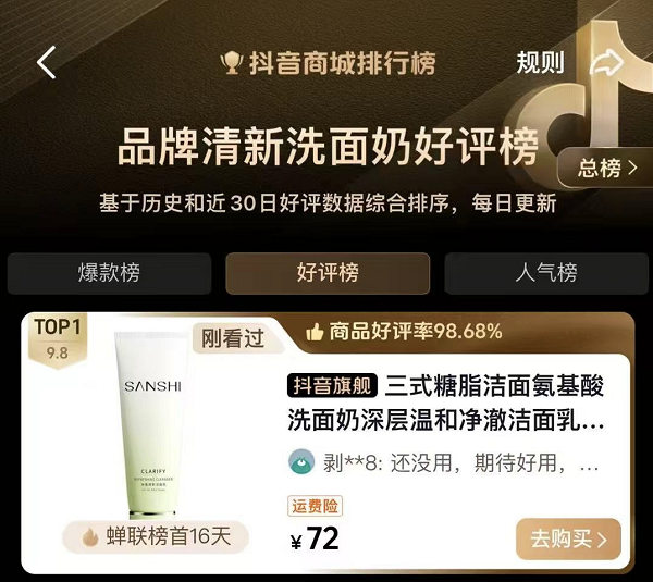 值得注意的是,品牌還可以通過合作短劇+短視頻+直播聯動的方式實現極致種收。前文提到的品牌三式,除4集達人定制短劇外,投放1條達人種草視頻并掛車,同時千川加熱進行追投,視頻綜合ROI達到2。短劇發布1周后的達人直播大場,GMV相較于日均環比提升503%,主推品在洗面奶好評榜蟬聯榜首16天。
