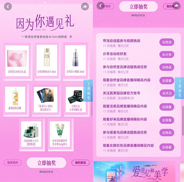 巨量星圖為品牌定制H5活動頁,直接將品牌話題、精選內容和主推產品羅列其中,用戶點擊相關入口即可直接跳轉話題頁、商品頁或視頻詳情頁。該活動頁還以抽獎的方式激勵用戶參與、分享品牌話題,關注品牌賬號,觀看品牌直播間等,通過提高用戶的話題參與度,帶動品牌各方面聲量。