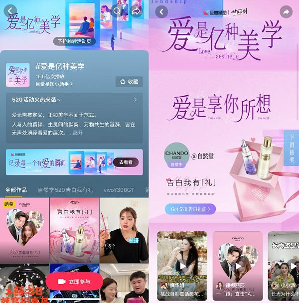 在主話題中,一些品牌也聚焦于520相關的具體場景,創造了自己的細分內容場。比如自然堂錨定“告白”這個讓人心動的詞語,與巨量星圖共創話題#自然堂520告白我有禮,從而進一步激發用戶的共鳴與討論。