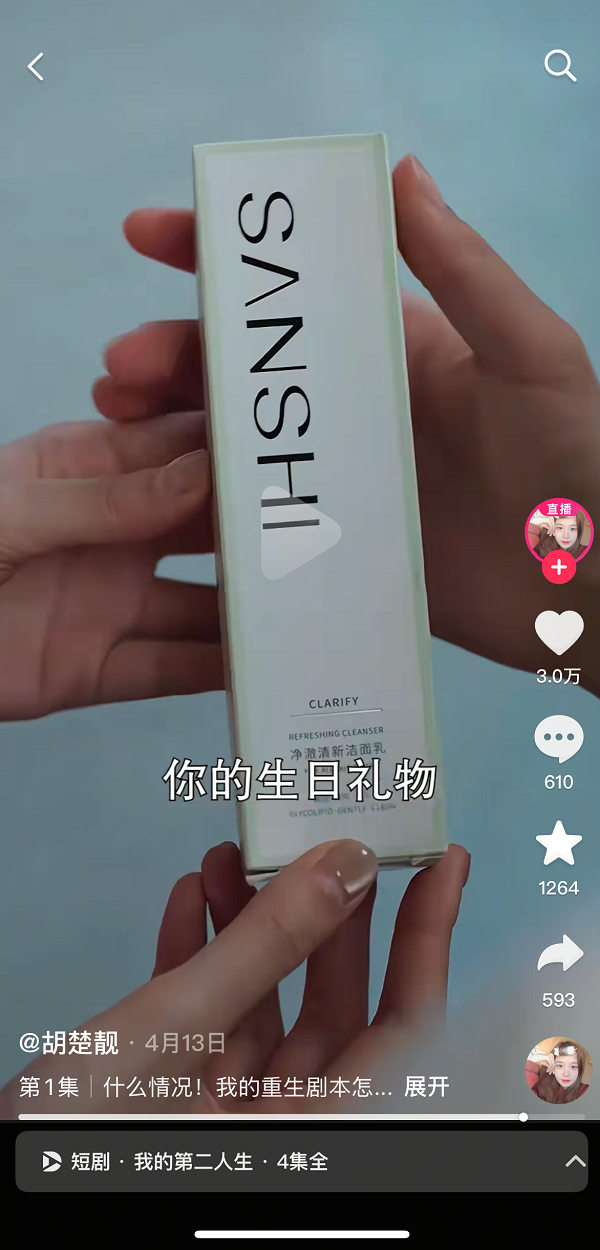 由短平快卻引人入勝的劇情推動,短劇也成為品牌首選的營銷方式。新銳護膚品牌三式首次破冰達人短劇,將產品融入重生/成長題材,定制4集短劇,看播次數達到1800萬次,爆文率100%。