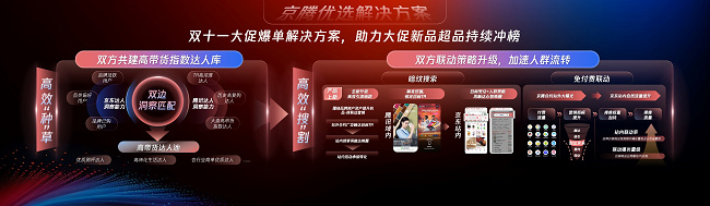 面對即將到來的京東11.11,京東與騰訊廣告在會上聯合發布11.11大促爆單解決方案,通過雙方數據能力,共建“高帶貨指數達人庫”實現高效種草,通過站外合約廣泛觸達-站內搜索再觸達-站內活動承接轉化的高效引流鏈路助力品牌商家大促實現高效增長。