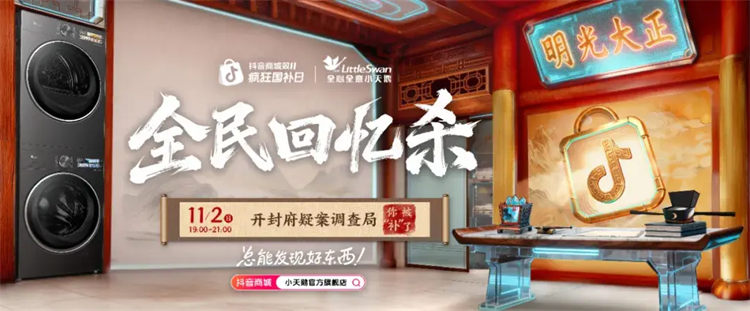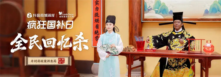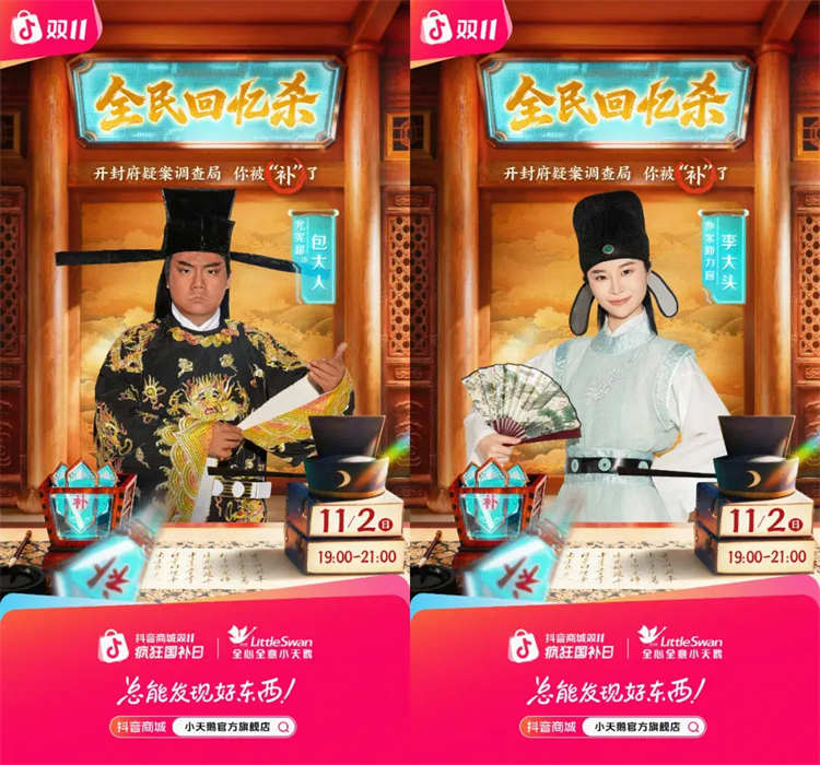 這場名為《開封府疑案調(diào)查局· 你被“補”了》的主題直播,是抖音商城「全民回憶殺」IP攜手國民品牌小天鵝在雙11期間共創(chuàng)的一場直播內(nèi)容事件。